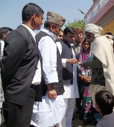 उत्तर प्रदेश के मुख्यमंत्री श्री अखिलेश यादव दिनांक 06 मार्च, 2013 को बलीपुर घटना के पीडि़तों को उनके गांव पहुंचकर आर्थिक मदद देते हुए। साथ में हैं नगर विकास मंत्री श्री मोहम्मद आजम खाँ।