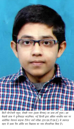 edited-harsh-gupta1 9 अप्रैल। सिटी मोन्टेसरी स्कूल, गोमती नगर (प्रथम कैम्पस) के मेधावी छात्र हर्ष गुप्ता ने नेशनल साइन्स टैलेन्ट सर्च परीक्षा (एन.एस.टी.एस.ई.) में लखनऊ शहर में प्रथम रैंक अर्जित कर विद्यालय का नाम गौरवान्वित किया है। यह प्रतियोगिता यूनीफाइड काउन्सिल, नई दिल्ली द्वारा अखिल भारतीय स्तर पर आयोजित हुई। यह जानकारी सी.एम.एस. के मुख्य जन-सम्पर्क अधिकारी श्री हरि ओम शर्मा ने दी है। श्री शर्मा ने बताया कि इस प्रतियोगिता का आयोजन भावी पीढ़ी के वैज्ञानिक दृष्टिकोण को विकसित करना था जिसमें देश के अनेक प्रतिष्ठित विद्यालयों के छात्रों ने प्रतिभाग कर अपनी प्रतिभा का जोरदार प्रदर्शन किया। प्रतियोगिता में सी.एम.एस. गोमती नगर (प्रथम कैम्पस) के इस मेधावी छात्र ने अपने ज्ञान व प्रतिभा के दम पर लखनऊ शहर में सर्वोच्च स्थान अर्जित कर परचम लहराया है। प्रतियोगिता के आयोजकों ने हर्ष गुप्ता की भूरि-भूरि प्रशंसा करते हुए प्रशस्ति पत्र व अन्य आकर्षक उपहारों से सम्मानित किया है।