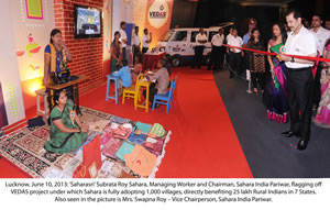 edited-pic-1 भारत के प्रमुख व्यावसायिक संस्थान सहारा इंडिया परिवार ने आज 1000 गांवों को पूर्णतः गोद लेने के प्रोग्राम की शुरळआत की। ‘वेदास’ नाम से लांच हुए इस प्रोजेक्ट को ‘सहाराश्री’ सुब्रत राॅय सहारा, मैनेजिंग वर्कर एवं चेयरमैन, सहारा इंडिया परिवार ने फ्लैग आॅफ किया और इसके साथ ही उत्तर प्रदेश में कन्नौज तथा बिहार में अररिया के 172 गांवों में प्रोजेक्ट लागू हो गया। वेदास के अन्तर्गत सहारा 1000 गांवों को समग्र विकास हेतु गोद ले रहा है। प्रोजेक्ट का लक्ष्य 4.5 लाख ग्रामीण परिवारों को अंगीकृत करने का है, जिससे 7 राज्यों के लगभग 25 लाख लोग प्रभावित होंगे।