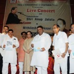 विशिष्ट अतिथि, मा0 श्री अरविन्द सिंह ’गोप’ ने कहा कि आजकल महिलाएं पुरुषों से किसी भी क्षेत्र में पीछे नहीं हैं। अतः हमें लड़के व लड़कियों के बीच भेदभाव को मिटाने के लिए आगे आना चाहिए। मुख्य अतिथि द्वारा फनकारों को प्रतीक-चिन्ह व पुष्पगुच्छ देकर स्वागत किया गया। विश्व के प्रख्यात व जाने-माने फनकार पद्मश्री श्री अनूप जलोटा जी ने ’’ऐसी लागी लगन’’ व ’’जग में सुन्दर है दो नाम ’’ भजन गाकर श्रोताओं को मंत्रमुग्ध कर दिया। शहर के प्रख्यात फनकार श्री मिथिलेश लखनवी जी ने अपने साथियों श्री सुभाष शर्मा, श्री गुंजन मैसी, श्री श्याम अवस्थी, श्री राकेश आर्या, प्रियंका मेहरोत्रा व निशा सिंह के साथ भजन ’’जहां-जहां प्रभु का स्थल हो वहां-वहां जाऊं’’ व वाली आसी जी की गजल ’’हम फकीरो की जो चाहे दुआ ले जाये ’’गाकर श्रोताओं का दिल जीत लिया।
