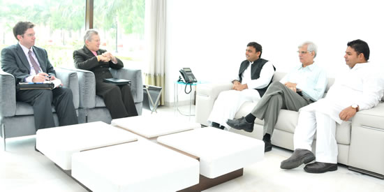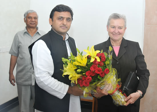 उत्तर प्रदेश के मुख्यमंत्री श्री अखिलेश यादव 14 अगस्त, 2013 को अपने सरकारी आवास 5, कालिदास मार्ग पर भारत में अमेरिका की राजदूत सुश्री नैन्सी जे0 पाॅवेल से भेंट करते हुए।