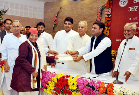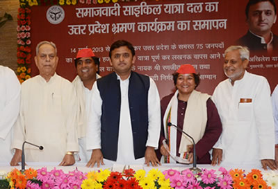 समाजवादी पार्टी की नीतियों और सरकार की उपलबिधयों को गांव-गांव तक पहुचाने के लिए 14 मार्च,2013 से प्रारम्भ प्रदेश के सभी 75 जनपदो की 10 हजार कि0मी0 की यात्रा पूरी कर लखनऊ वापस आने पर आज मुख्यमंत्री श्री अखिलेश यादव ने समाजवादी साइकिल यात्रा दल के नायक श्री रणजीत बच्चन तथा नायिका सुश्री कालिन्दी निर्मल शर्मा का मुख्यमंत्री आवास में आयोजित एक समारोह में स्वागत किया। दोनों साइकिल यात्रियों को षाल ओढ़ाकर और 5-5 लाख रूपए देकर सम्मानित किया गया।