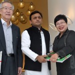 उत्तर प्रदेश के मुख्यमंत्री श्री अखिलेश यादव से 10 जनवरी, 2015 को उनके सरकारी आवास पर संयुक्त राष्ट्र में दक्षिण कोरिया के पूर्व राजदूत श्री म्युंग चुई हाम, गेनेवाॅन कम्पनी की सी0ई0ओ0 सुश्री टे ह्वा ली।