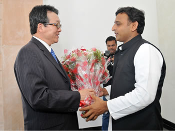 उत्तर प्रदेश के मुख्यमंत्री श्री अखिलेश यादव से आज कोरिया गणराज्य के राजदूत श्री जून ग्यू ली ने उनके सरकारी आवास पर मुलाकात की।