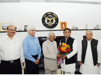 इस अवसर पर भारत के पूर्व राष्ट्रपति डाॅ0 ए0पी0जे0 अब्दुल कलाम ने मुख्यमंत्री से राज्य के चतुर्दिक विकास पर विस्तृत चर्चा करते हुए कहा कि उत्तर प्रदेश देश की दूसरी सबसे बड़ी अर्थव्यवस्था है और देश का हर पांचवां युवा यहांका वासी है। उन्होंने कहा कि इस राज्य के विकास में यहां के आई.आई.टी., आई.आई.एम. जैसे प्रमुख संस्थान महत्वपूर्ण भूमिका निभा सकते हैं। उन्होंने कहा कि वर्ष 2020 तक प्रदेश में प्रति व्यक्ति आय वर्तमान 33,000रुपए से बढ़ाकर 1 लाख 20 हजार करने की आवश्यकता है। उन्होंने कहा कि इसके लिए प्रदेश के 25 मिलियन युवाओं को विश्व स्तरीय कौशल से समृद्ध करना होगा। साथ ही, राज्य में अवस्थापना सुविधाओं के विकास, नौपरिवहन तथा सड़क अवस्थापना पर विशेष ध्यान देना होगा। बिजली के क्षेत्र में राज्य को सोलर पावर तथा बगास का इस्तेमाल करते हुए अपनी उत्पादन क्षमता बढ़ानी होगी। उन्होंने राज्य में लघु उद्योगों को बढ़ावा देने का भी सुझाव दिया।