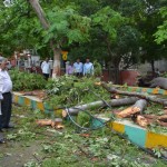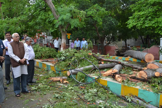 आज दोपहर में अचानक तेज हवा और बारिश से राजभवन के गेट नं0 2 के पास महात्मा गांधी मार्ग पर लगा पुराना सेमल का पेड़ गिर गया। पेड़ के गिरने से राजभवन की चाहरदीवारी भी क्षतिग्रस्त हुई और बाहर महात्मा गांधी मार्ग पर यातायात बाधित हो गया। राज्यपाल श्री राम नाईक को जैसे ही यह ज्ञात हुआ तब संवेदनशीलता का परिचय देते हुये वे स्वयं राजभवन से बाहर निकलकर आये और समस्या का जायजा लिया। श्री नाईक ने सड़क पर गिरे पेड़ को तुरंत हटाने के लिये वन विभाग के अधिकारियों को निर्देश दिये तथा साथ ही साथ यातायात को सुचारू करने हेतु यातायात पुलिस को भी निर्देश दिये।