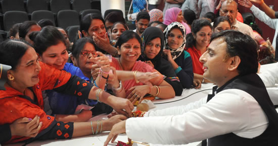 आज श्री अखिलेश यादव को राखी बांधने विभिन्न संगठनों की सैकड़ो महिलाएं, जिनमें अल्पसंख्यक महिलाएं भी बड़ी तादाद में थी। बृृहृमकुमारी समाज की वी केकोमल के नेतृृत्व में आई बहनांे ने उनको राखी बांधी। श्री जनेश्वर मिश्र की बेटी ने भी उन्हें राखी बांधी। इसके अतिरिक्त कुमारी सिद्धि विद्यार्थी तथा हर्शवर्धन अग्रवाल के साथ हेल्प यू ट्रस्ट, सुश्री अल्पना मेहरोत्रा, सेक्रेटरी आरोह वेलफेयर सोसायटी, इन्दिरानगर, के साथ बड़ी संख्या में बहनों ने राखी बांधी। लखनऊ विश्वविद्यालय की छात्र-नेत्री सुश्री पूजा शुक्ला, धानुक समाज की दीपिका, स्वीटी और श्वेता तथा समाजवादी महिला सभा की राष्ट्रीय कार्यकारिणी सदस्य सुश्री मोनिका नाज खान आदि ने भी रक्षा बंधन पर्व पर राखी बांधकर श्री अखिलेश यादव का अभिनंदन किया।