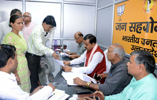 06-3भाजपा प्रदेश मुख्यालय लखनऊ में चल रहे जन सहयोग केंद्र में शनिवार को भाजपा प्रदेश अध्यक्ष व उत्तर प्रदेश सरकार में उपमुख्यमंत्री केशव प्रसाद मौर्य ने पीड़ितों की समस्याओं को सुना। उप मुख्यमंत्री ने पीड़ितों की समस्याओं का समाधान मौके पर ही करवाया। साथ ही कई समस्याओं पर संबन्धित अधिकारियों से बातचीत की। एवं कई अन्य समस्याओं के समाधान के लिए निर्देश भी दिए।