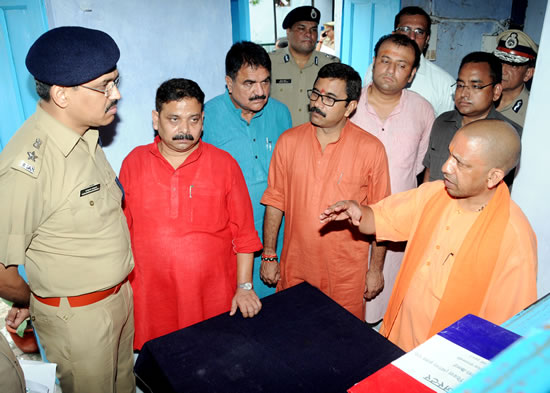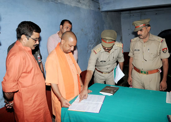 press-151उत्तर प्रदेश के मुख्यमंत्री योगी आदित्यनाथ जी ने आज अपने दो दिवसीय जनपद वाराणसी दौरे के दूसरे दिन कैण्ट थाना का औचक निरीक्षण किया। उन्होंने अपराध पर प्रभावी नियंत्रण किए जाने पर जोर देते हुए पुलिस अधिकारियों को निर्देशित किया कि थानों पर समाधान दिवस के मौके पर भूमि विवाद के आने वाले मामलों में आवश्यकतानुसार हर हालत में 3 दिन के अन्दर पैमाइश की कार्यवाही की जाए। उन्होंने कहा कि लगभग बड़ी घटनाओं में भूमि विवाद प्रमुख होते हैं। यदि भूमि विवाद के प्रकरणों का त्वरित गति से निस्तारण कराया जाए, तो सम्भावित बड़ी घटनाओं पर प्रभावी रोक लगाई जा सकेगी। उन्होंने थानों में आने वाले छोटे से छोटे मामलों का त्वरित संज्ञान लेकर प्रभावी कार्यवाही किए जाने के निर्देश दिए, ताकि सम्भावित बड़ी घटनाओं पर रोक लग सके। press-141