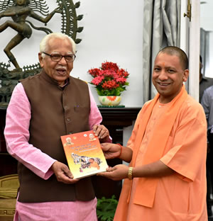 aks_81661उत्तर प्रदेश के राज्यपाल श्री राम नाईक से आज राजभवन में प्रदेश के मुख्यमंत्री योगी आदित्यनाथ ने शिष्टाचारिक भेंट की तथा सरकार के 6 माह पूरे होने पर जारी ‘बढ़ चला उत्तर प्रदेश एक नई दिशा की ओर’ पुस्तिका की प्रथम प्रति भेंट की। मुख्यमंत्री ने इसी के साथ कल जारी की गई एक अन्य पुस्तिका ‘श्वेत पत्र 2017 उत्तर प्रदेश सरकार’ की प्रति भी दिया।