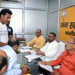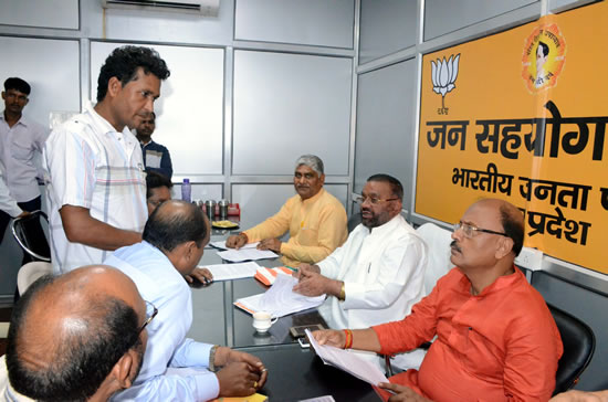04-2भारतीय जनता पार्टी प्रदेश मुख्यालय में जन सहयोग केन्द्र पर कैबिनेट मंत्री स्वामी प्रसाद मौर्य के साथ प्रदेश उपाध्यक्ष डा0 राकेश त्रिपाठी एवं जसवंत सिंह सैनी सुबह 10.30 बजे से दोपहर 02 बजे तक जन समस्याओं के समाधान में जुटे। कैबिनेट मंत्री स्वामी प्रसाद मौर्य ने अपने विभाग की योजनाओं के बारे में जानकारी देते हुए बताया कि श्रम सेवायोजन विभाग समाज के अंतिम पायदान के लोगों से जुड़ा विभाग है। मजदूरों के हित में मोदी सरकार और योगी सरकार मजूदरों के बीच पहुंच कर उनकी मदद को संकल्पित है।
