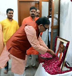 08लखनऊ 23 अक्टूबर 2017, भारतीय जनता पार्टी के प्रदेश अध्यक्ष डा0 महेन्द्र नाथ पाण्डेय जी ने आज वरिष्ठ प्रचारक तथा किसान संघ के राष्ट्रीय संगठन मंत्री संकटा प्रसाद सिंह जी के निधन पर संघ कार्यालय केशव भवन जाकर अपनी विनम्र श्रद्धाजंलि दिया। डा0 महेन्द्र नाथ पाण्डेय जी ने स्व0 संकटा प्रसाद सिंह को राष्ट्र र्निमाण के लिए सर्मर्पित भारत माता का सपूत बताया। श्री पाण्डेय जी ने कहा कि श्री संकटा प्रसाद सिंह मूल रूप से गाजीपुर जनपद के निवासी थे तथा 1942 में इण्टर मीडिएट की शिक्षा के दौरान ही पूज्य गुरू जी से प्रसंग वश भेंट के बाद अपना पूरा जीवन राष्ट्रीय स्वयं सेवक संघ के माध्यम से राष्ट्र सेवा में लगा दिया तथा किसानों की समस्याओं के निदान तथा किसानों की खुशहाली के लिए जीवन पर्यन्त कार्य करते रहे। उन्होंने कहा कि स्वं डा0 संकटा प्रसाद सिंह जी का जीवन ऋषितुल्य राष्ट्र व समाज को समर्पित रहा ऐसी, महान आत्मा वन्दनीय है।
