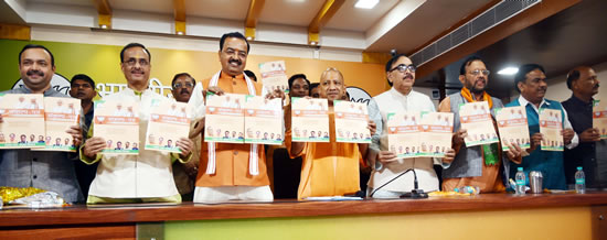 लखनऊ 12 नवम्बर 2017, भारतीय जनता पार्टी ने रविवार को प्रदेश मुख्यालय में नगर निकाय चुनाव के संकल्प पत्र जारी किया। प्रदेश अध्यक्ष डा. महेन्द्र नाथ पाण्डेय, मुख्यमंत्री मा. योगी आदित्यनाथ, उपमुख्यमंत्री मा. केशव प्रसाद मौर्य, डा. दिनेश शर्मा, नगर विकास मंत्री सुरेश खन्ना ने संकल्प पत्र का संयुक्त रूप से प्रेस को जारी किया।