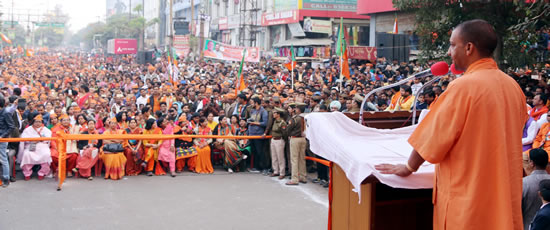 योगी आदित्यनाथ ने कहा कि पिछली सरकारों में व्याप्त भ्रष्टाचार और अपराध की वजह से व्यापारी और उद्योगपति इस प्रदेश से पलायन कर गया था। जब से भाजपा की सरकार इस प्रदेश में सत्ता में आयी है। गुण्डे बदमाश प्रदेश छोडकर भाग रहे है या तो जेल डाले जा रहे है। कई दुर्दान्त अपराधी पुलिस मुठभेड में मारे जा चुके है। प्रदेश में सुरक्षा का वातावरण हैं। अब भय का वातावरण समाप्त होने के कारण बडी संख्या में उद्योगपति और व्यापारी आज प्रदेश में पुनः निवेश करके उद्योग लगाना चाह रहे है। नगर निकाय मेंसभी स्ट्रीट लाइटों को बदलकर एलईडी लाइटे लगाई जायेगी। इससे निकाय का बिजली का बिल कम आयेगा और अधिक पैसा आप के विकास के लिए खर्च होगा।