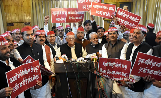 उत्तर प्रदेश विधानमण्डल के शीतकालीन सत्र के पहले दिन आज समाजवादी पार्टी के विधायकों ने विधान सभा और विधान परिषद में सŸाारूढ़ दल भाजपा की जनविरोधी नीतियों का विरोध किया। दोनों सदनों में समाजवादी विधायकों ने भाजपा सरकार पर विपक्ष को उत्पीड़ित करने, अपराध की घटनाओं में अंधाधुंध वृद्धि, कानून व्यवस्था की बदतर हालत, विद्युत दरों में भारी वृद्धि के साथ किसानों, नौजवानों और गरीबों के हित की समाजवादी सरकार की योजनाओं को बंद कर देने के खिलाफ आवाज उठाई। 14-12-a