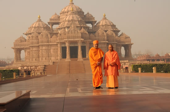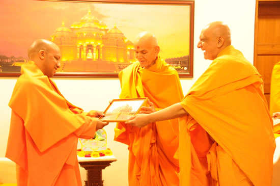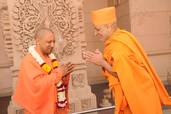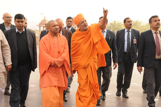 उत्तर प्रदेश के मुख्यमंत्री योगी आदित्यनाथ जी 3 फरवरी, 2018 को नई दिल्ली स्थित अक्षरधाम मंदिर का भ्रमण करते हुए तथा परम पूजनीय स्वामी महाराज जी से मिलते हुए।