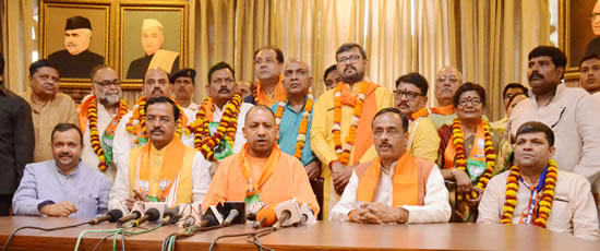भारतीय जनता पार्टी के नवनिर्वाचित विधान परिषद सदस्यों का भाजपा विधान मण्डल दल कार्यालय, विधान भवन मंे मुख्यमंत्री योगी आदित्यनाथ, उपमुख्यमंत्री केशव प्रसाद मौर्य व डा0 दिनेश शर्मा ने माला पहिनाकर एवं मिष्ठान खिलाकर हर्ष व्यक्त किया। भाजपा के दस एवं अपना दल (एस) के एक प्रत्याशी विधान परिषद में निर्विरोध निर्वाचित हुए। प्रदेश सरकार के मंत्री एवं भाजपा के राष्ट्रीय एवं प्रदेश स्तर के दायित्वों पर रहे डा0 महेन्द्र सिंह, प्रदेश महामंत्री विजय बहादुर पाठक, विद्यासागर सोनकर, अशोक कटारिया, पूर्व प्रदेश कोषाध्यक्ष एवं एमएलसी अशोक धवन, प्रदेश सरकार के मंत्री व पूर्व प्रदेश मीडिया पैनलिस्ट मोहसिन रजा, डा0 सरोजनी अग्रवाल, बुक्कल नबाव, यशवंत सिंह, जयवीर सिंह व अपना दल (एस) से आशीष पटेल विधान परिषद के निर्विरोध सदस्य निर्वाचित हुए।