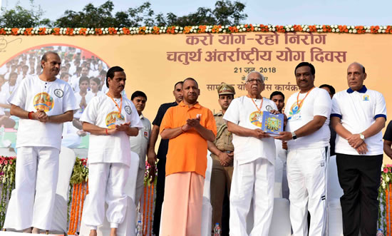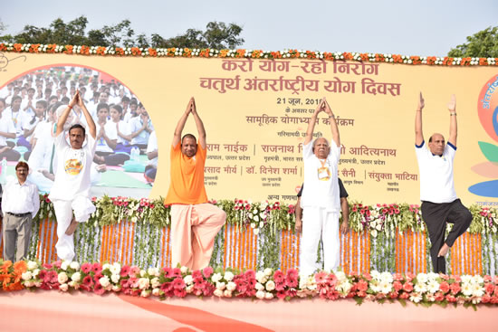 चतुर्थ अंतर्राष्ट्रीय योग दिवस के अवसर पर आज उत्तर प्रदेश आयुष विभाग द्वारा राजभवन प्रागंण में आयोजित सामूहिक योगाभ्यास कार्यक्रम में उत्तर प्रदेश के राज्यपाल श्री राम नाईक, केन्द्रीय गृहमंत्री श्री राजनाथ सिंह, मुख्यमंत्री योगी आदित्यनाथ, उप मुख्यमंत्री डाॅ0 दिनेश शर्मा, मंत्री श्री स्वामी प्रसाद मौर्य, आयुष राज्यमंत्री डाॅ0 धर्मसिंह सैनी, महापौर डाॅ0 संयुक्ता भाटिया, मुख्य सचिव श्री राजीव कुमार, पुलिस महानिदेशक श्री ओ0पी0 सिंह, अपर मुख्य सचिव सूचना श्री अवनीश अवस्थी, प्रमुख सचिव श्री नवनीत सहगल, सचिव आयुष श्री मुकेश कुमार मेश्राम, पंतजलि, गायत्री परिवार, यू0पी0 नेचरोपैथी टीचर, भारतीय योग संस्थान, तत्वमसी, ब्रह्म कुमारी प्रजापति ईश्वरीय विश्वविद्यालय, दिव्यांगजन, स्कूली छात्र-छात्राओं, सेना, एन0सी0सी0, सी0आर0पी0एफ0, एस0एस0बी0, आई0टी0बी0पी0, सी0आई0एस0एफ0 सहित बड़ी संख्या में प्रशासनिक एवं पुलिस अधिकारीगण ने उपस्थित होकर योग किया।