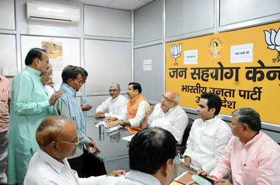 02लखनऊ 17 जुलाई 2018, भारतीय जनता पार्टी प्रदेश मुख्यालय में प्रत्येक मंगलवार को जनसमस्याओं के समाधान के अनवरत क्रम में प्रदेश सरकार के मंत्री सूर्य प्रताप शाही, डा. महेन्द्र सिंह व प्रदेश महामंत्री पंकज सिंह ने जनता की समस्याओं का निस्तारण किया। प्रदेश उपाध्यक्ष जसवंत सैनी व प्रदेश मंत्री धर्मवीर प्रजापति ने भी जनसमस्याओं के समाधान में सहयोग किया।