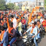 जय श्रीराम का नारा लगते हुए मोटर साईकिल पर ऊं अंकित पताका लगाये सर पर भगवा साफा और गले में भगवा पट्टिका लटकाये कार्यकर्ताओं का जोश हिलोंरें मार रहा था। शहर के सभी मार्गों पर कार्यकर्ताओं की बाईक रैली और जय श्रीराम के नारों से गूंजता शहर भगवामय नजर आ रहा था।