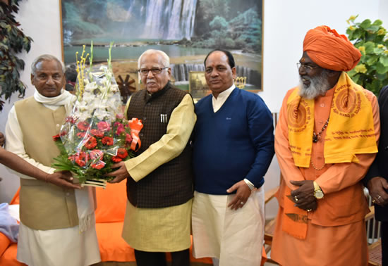 राज्यपाल ने पुष्प गुच्छ भेंट करते हुये श्री कल्याण सिंह के दीर्घायु एवं