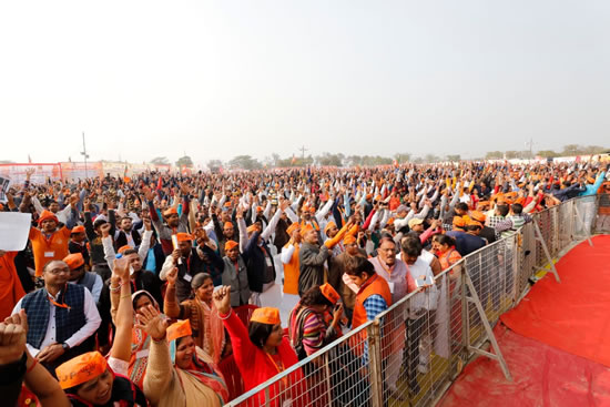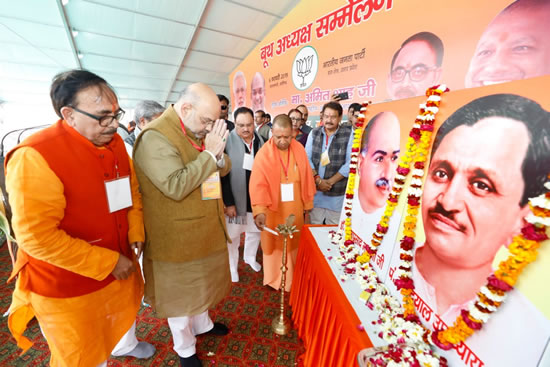 लखनऊ 06 फरवरी 2019, भारतीय जनता पार्टी ब्रज क्षेत्र के बूथ अध्यक्षों एवं सेक्टर प्रभारियों के सम्मेलन में पार्टी के राष्ट्रीय अध्यक्ष माननीय अमित भाई शाह ने सम्मेलन का उद्घाटन करते हुए बूथ विजय के लिए आवाह्न किया। रामघाट रोड, तालानगरी अलीगढ़ में बूथ अध्यक्षों को मुख्यमंत्री योगी आदित्य नाथ, केन्द्रीय मंत्री व प्रदेश प्रभारी जे.पी. नड्डा व प्रदेश अध्यक्ष डॉ. महेन्द्र नाथ पाण्डेय ने बूथ अध्यक्षों का अभिवादन करते हुए भाजपा का योद्धा बताया। photo-2