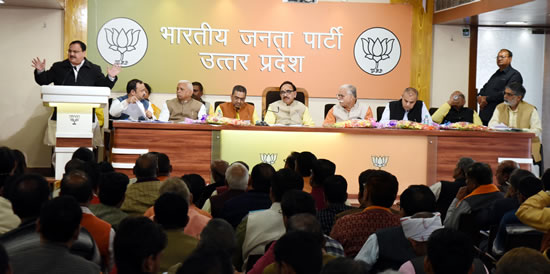 लखनऊ 21 फरवरी 2019, भारतीय जनता पार्टी उत्तर प्रदेश के लोकसभा चुनाव प्रभारी एवं केन्द्रीय मंत्री जेपी नड्डा ने आज कहा कि बूथ सम्पर्क अभियान में हम घर-घर तक पहुंचे और केन्द्र और प्रदेश की लोक कल्याणकारी योजनाओं का हिसाब किताब जनता तक पहुंचाये। उन्होंने कार्यकर्ताओं का आवाह्न किया कि मेरा बूथ सबसे मजबूत को विजय का मंत्र मानकर हम सबको काम करना होगा। श्री नड्डा ने बृहस्पतिवार को पार्टी मुख्यालय पर अवध क्षेत्र के पदाधिकारियों की बैठक को सम्बोधित करते यह बात कही। 34